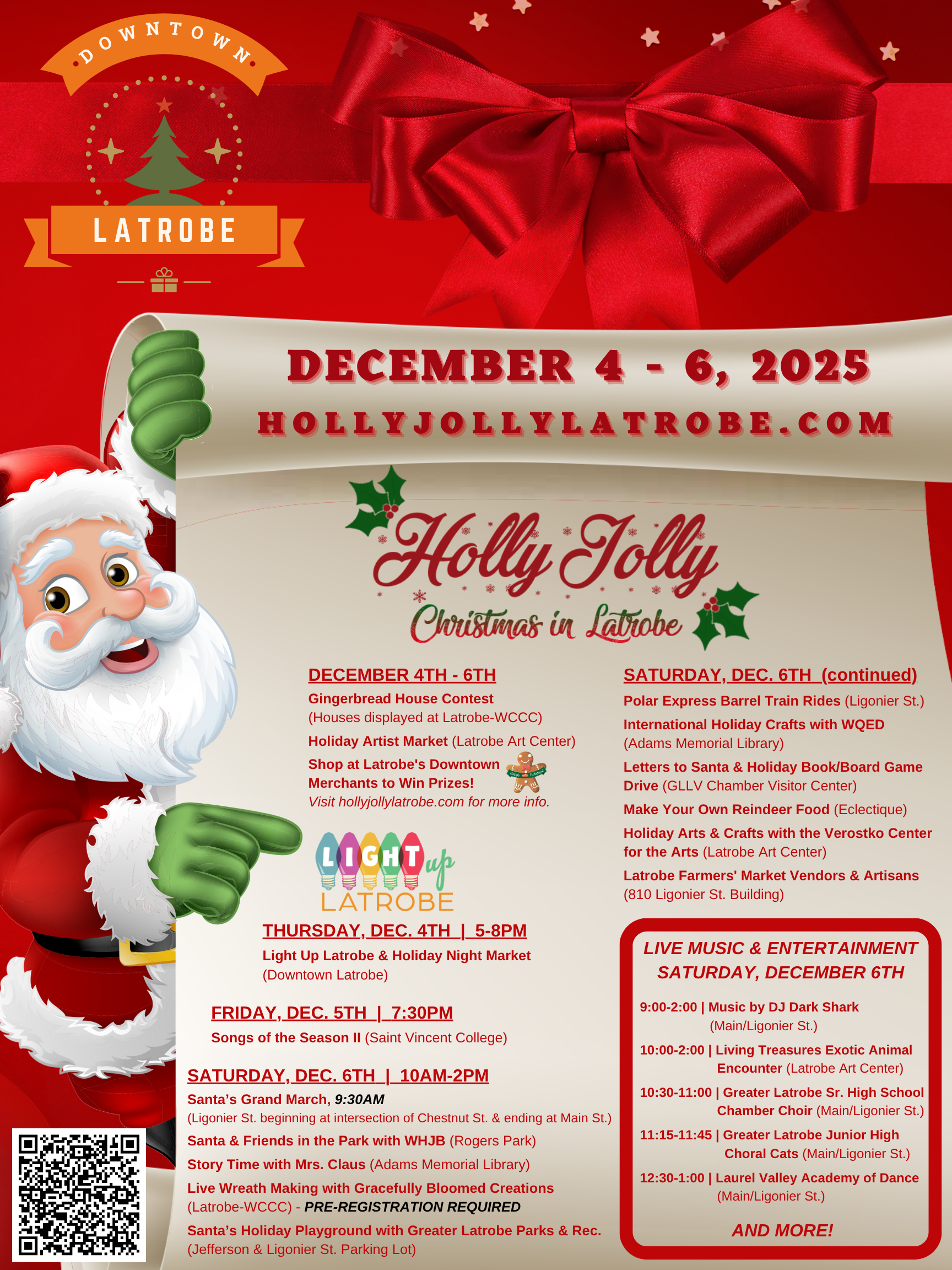 From Thursday, December 4 to Saturday, December 6, join the lovely city of Latrobe in celebrating the upcoming holiday season!  While this is a multi-day event, most activities will occur on Saturday, December 6 and will include: