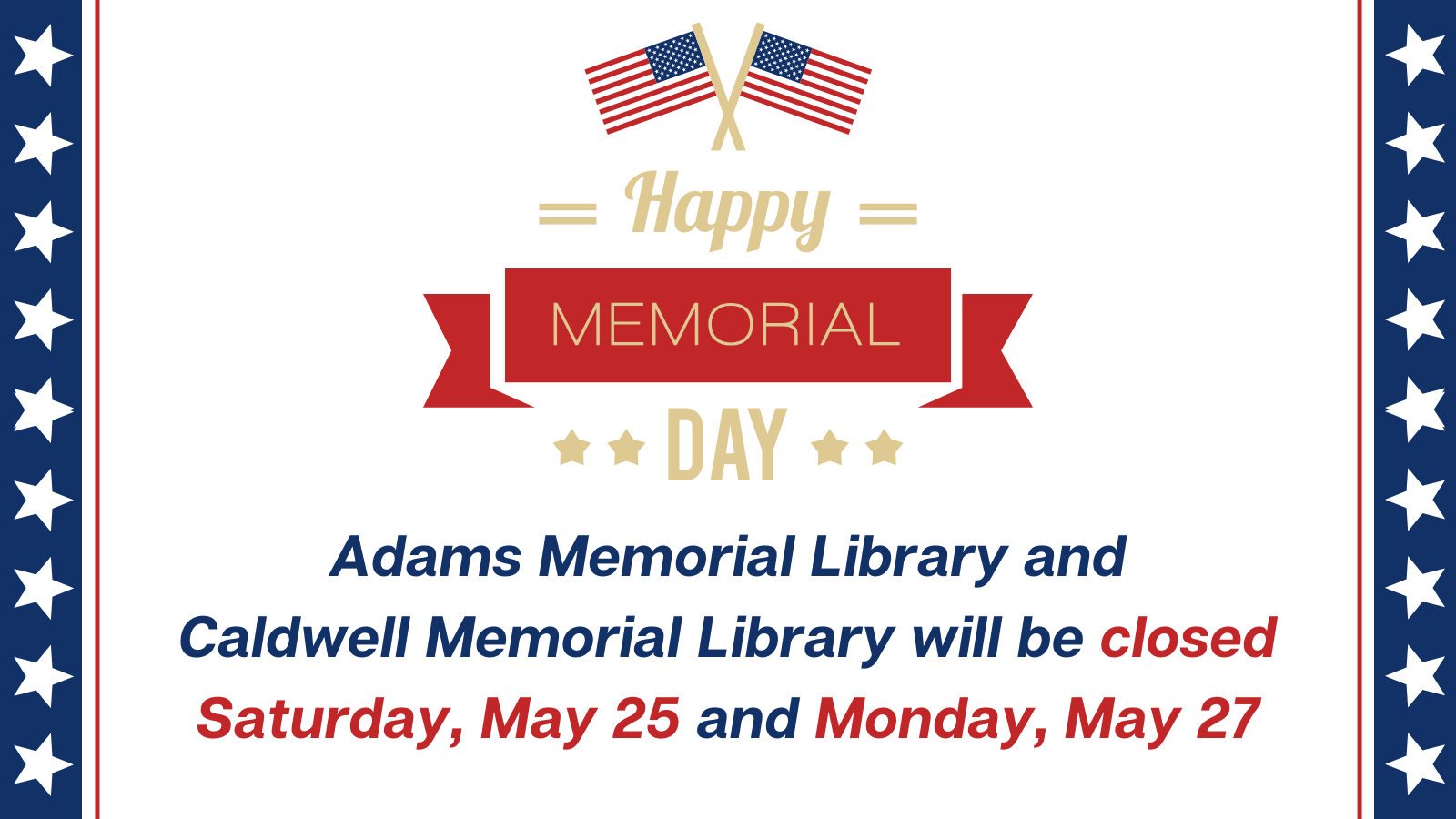 « All Events This event has passed. All Libraries CLOSED for Memorial Day May 25, 2024 - May 27, 2024 « Mystery Book Club Pitt Data Science Information Table » We’ll see you on Tuesday! Have a safe and happy weekend! Add to calendar Google Calendar iCalendar Outlook 365 Outlook Live Details Start: May 25, 2024 End: May 27, 2024 Event Category: Modified Hours Event Tags:Adams Memorial Library, AML, Caldwell Memorial Library, CML, Memorial Day, modified hours
