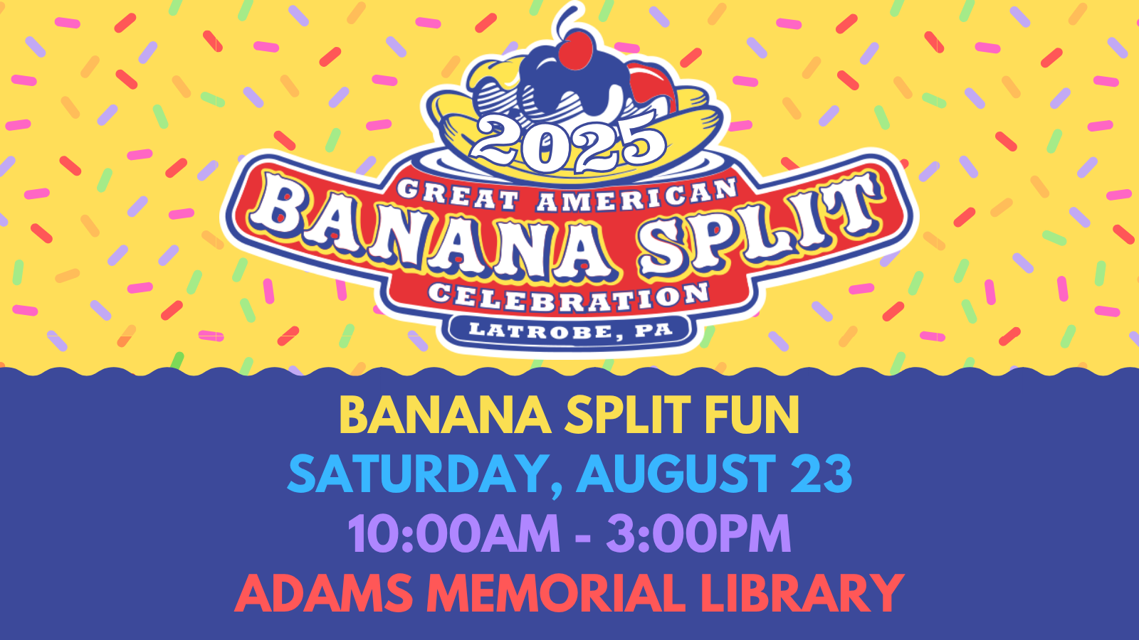 « All Events This event has passed. Banana Split Fun August 23 @ 10:00 am - 3:00 pm « Wee Read Needlework Night » Stop by the library and cool off! From 10AM to 3PM, we’ll be having fun activities for you to enjoy while you beat the heat! No registration is required! Add to calendar Google Calendar iCalendar Outlook 365 Outlook Live Details Date: August 23 Time: 10:00 am - 3:00 pm Event Category: All Ages Venue Adams Memorial Library 1112 Ligonier Street Latrobe, PA 15650 United States + Google Map Phone 7245374383 View Venue Website