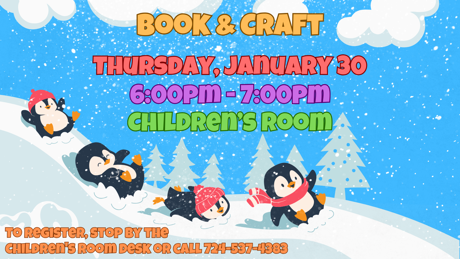 To register, call the Children’s Room at 724-537-4383 or stop by the Children’s Room desk.