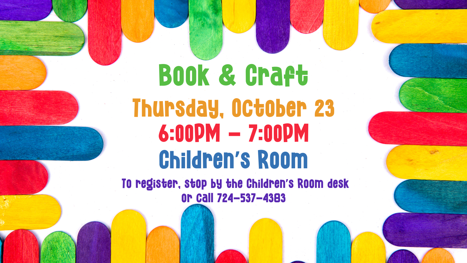 To register, call the Children’s Room at 724-537-4383 or stop by the Children’s Room desk.