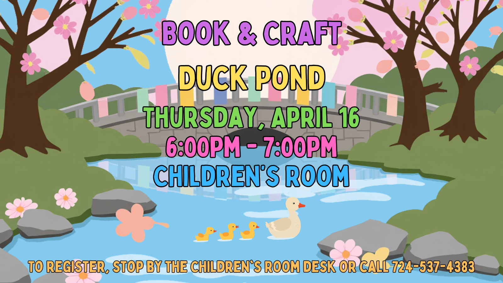 To register, call the Children’s Room at 724-537-4383 or stop by the Children’s Room desk.