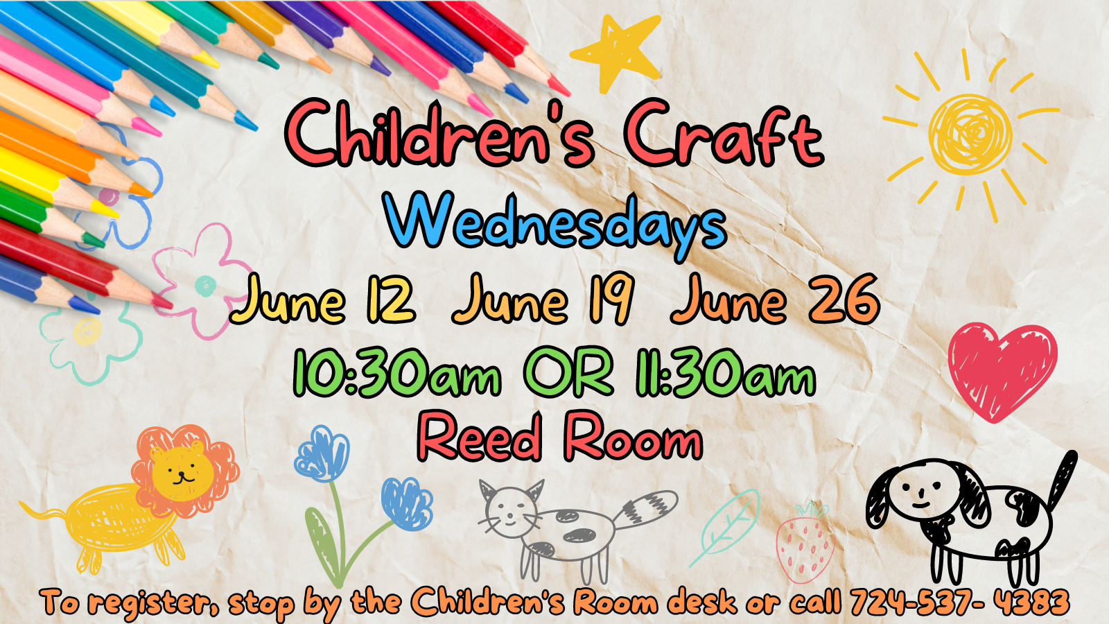To register, stop by the Children’s Room desk or call 724-537- 4383.