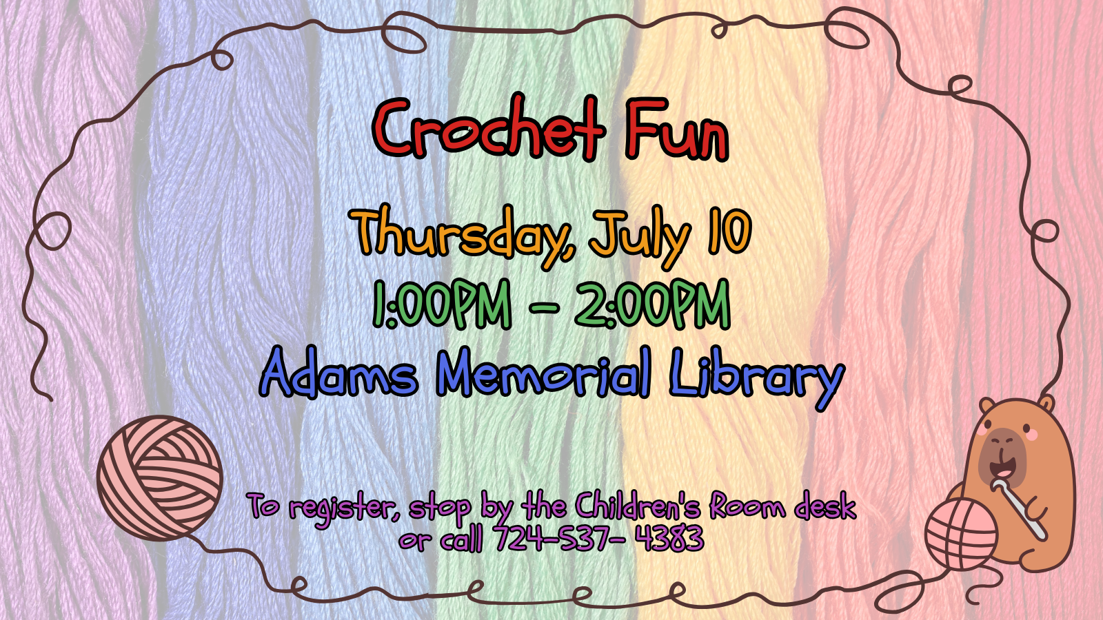 To register, stop by the Children’s Room desk or call 724-537-4383.