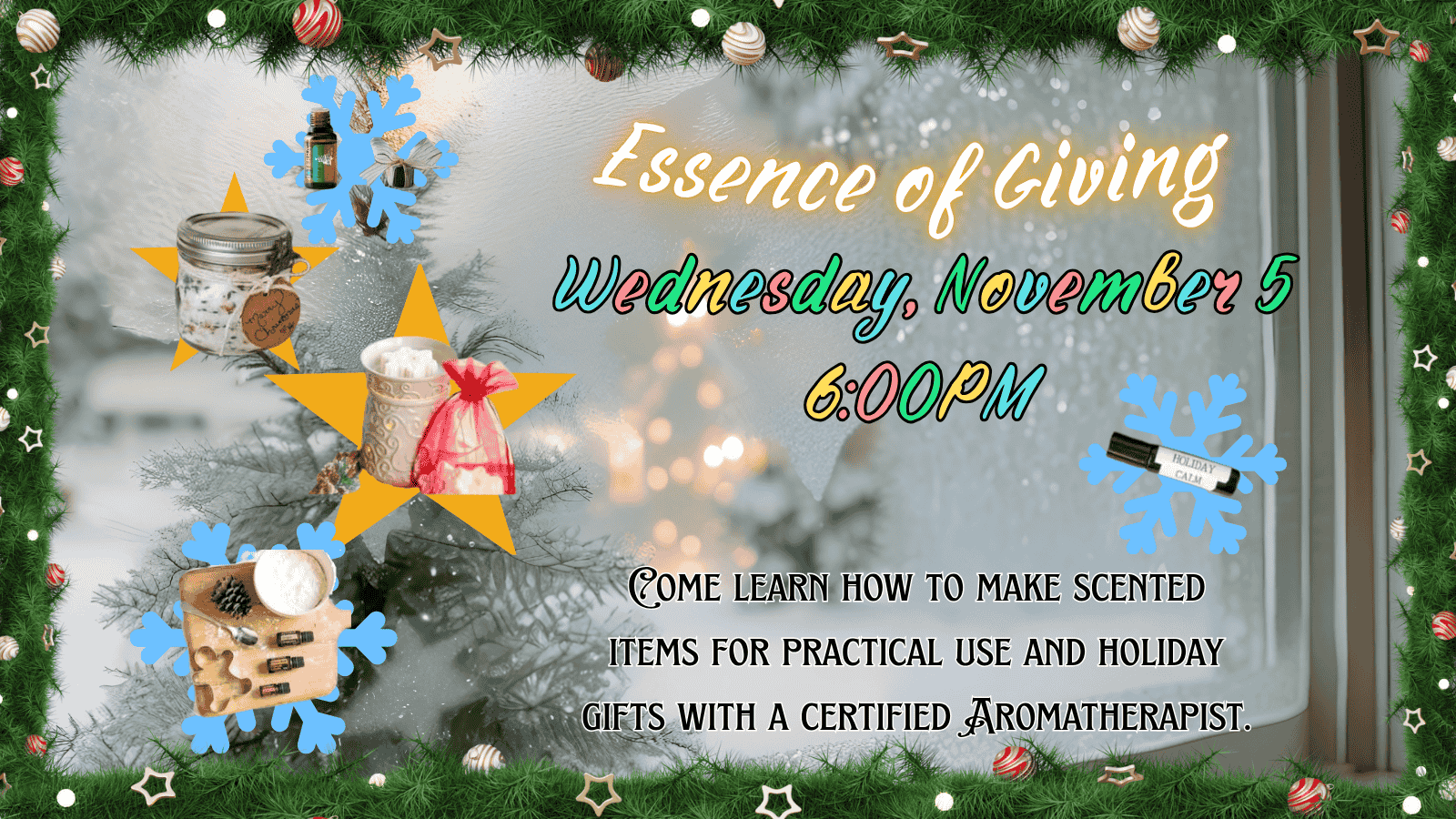 Come learn how to make scented items for practical use, or to give as holiday gifts with a certified Aromatherapist!