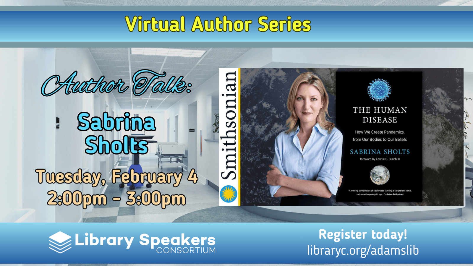 Smithsonian curator Sabrina Sholts is joining us online to discuss the uncomfortable but all-too-timely message of The Human Disease: How We Create Pandemics, From Our Bodies to Our Beliefs, which travels through history and around the globe to examine how and why pandemics are an inescapable threat of our own making.