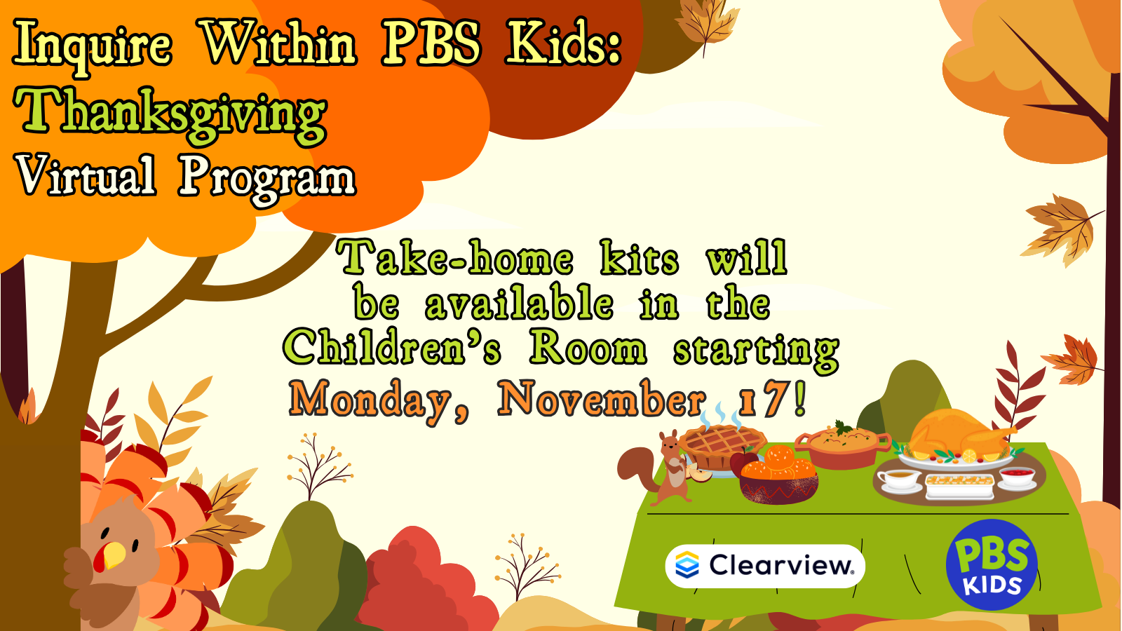 Thanks to our friends at WQED Education and Clearview Federal Credit Union, take home kits will be available in the Children’s Room starting Monday, November 17, so you can follow along on our website or social media!