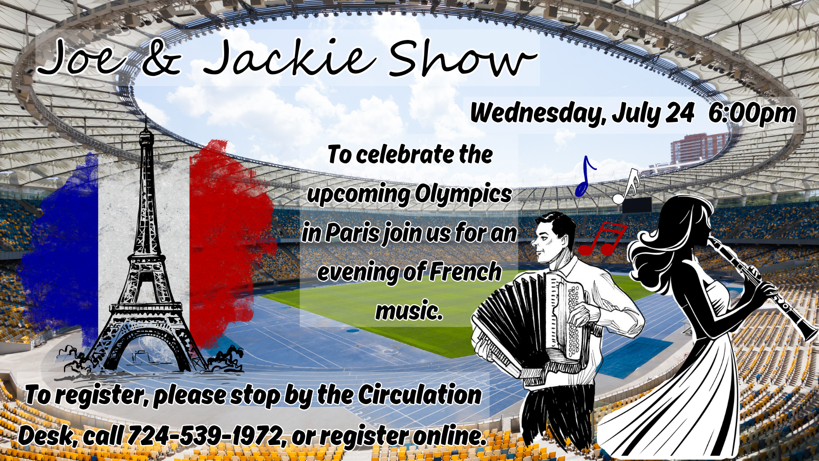 To celebrate the upcoming Olympics in Paris join us for an evening of French clarinet and accordion music performed by the talented duo of Joe & Jackie! This is for all ages!
