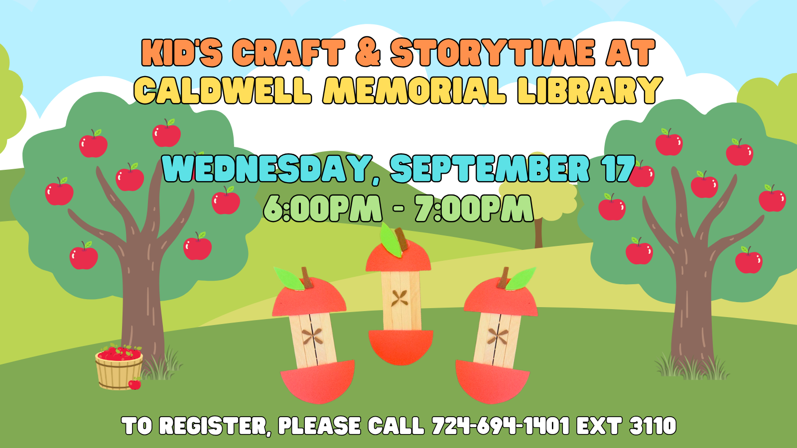 Roll on over to Caldwell Memorial Library and “pick” your very own apple! Enjoy this fun craft and hear some great Fall and apple stories too!