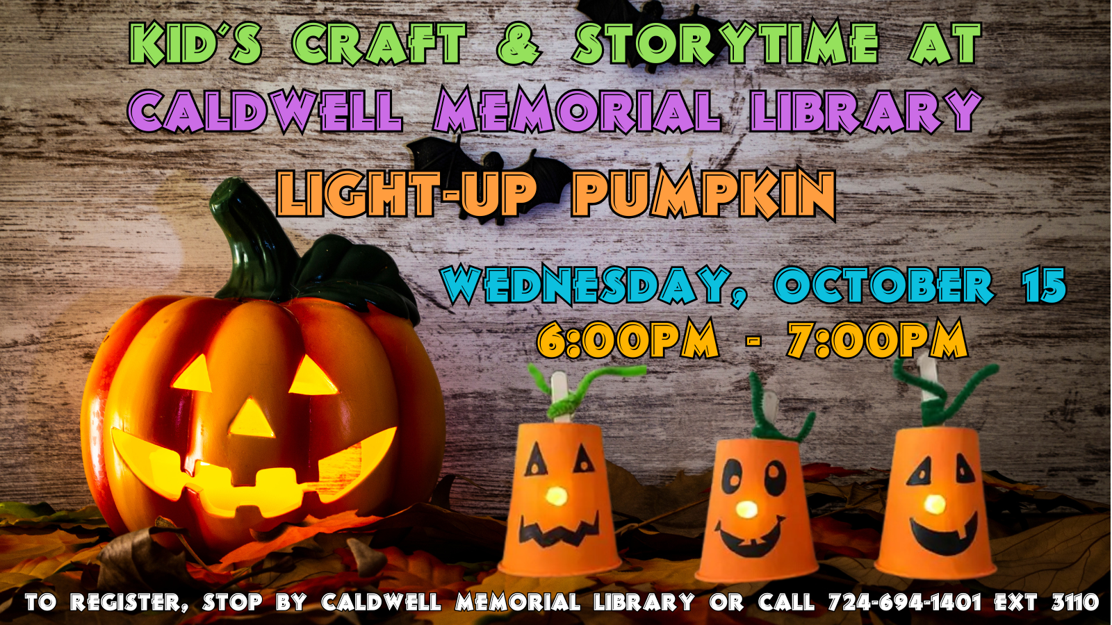 Get on your broom and fly to Caldwell Memorial Library this month to make your own light-up pumpkin craft and hear some spooky stories!