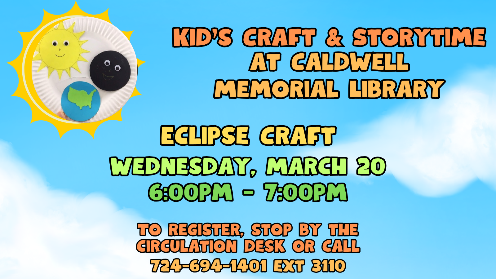 Just in time for the April eclipse, you can come to Caldwell Memorial Library to make your very own eclipse craft and listen to stories about the moon, sun, stars, and everything in between!