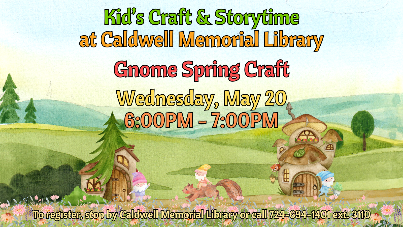 Stop by Caldwell Memorial Library for a phe-gnome-enal craft and hear stories featuring everyone’s favorite hat-wearing creature: gnomes!