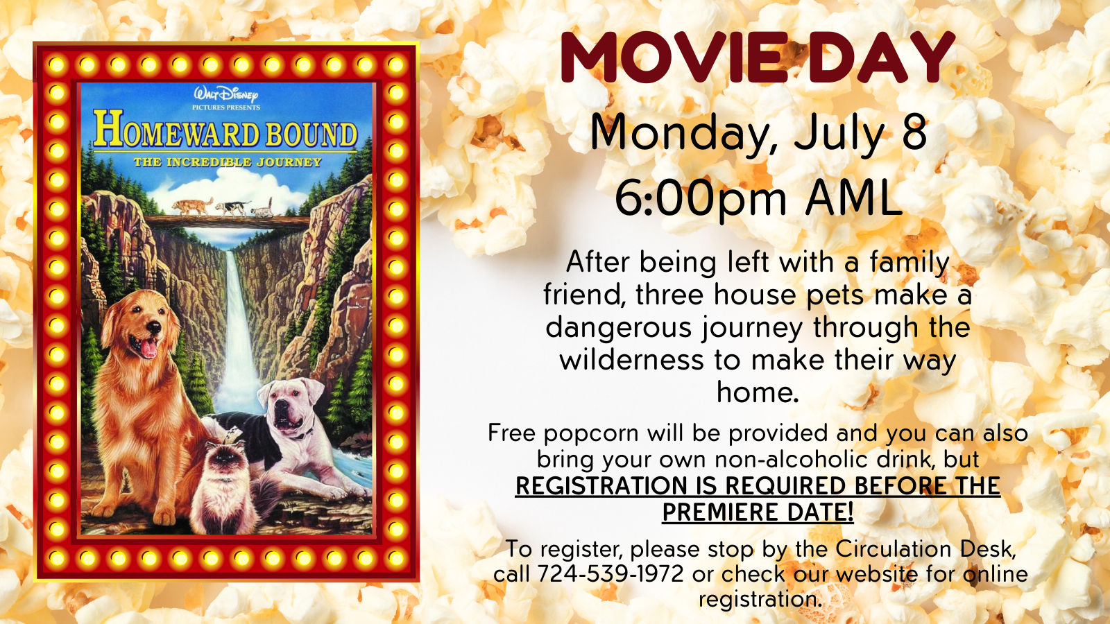 Beat the heat and watch a summer reading-themed movie! For July, we’re showing Homeward Bound.