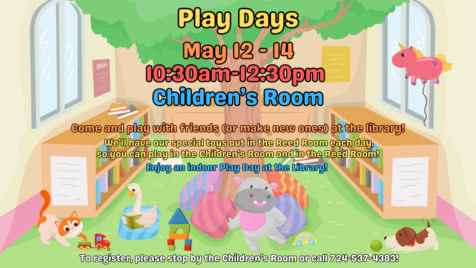 Enjoy an indoor Play Day at the library! To register, please stop by the Children’s Room or call 724-537-4383!