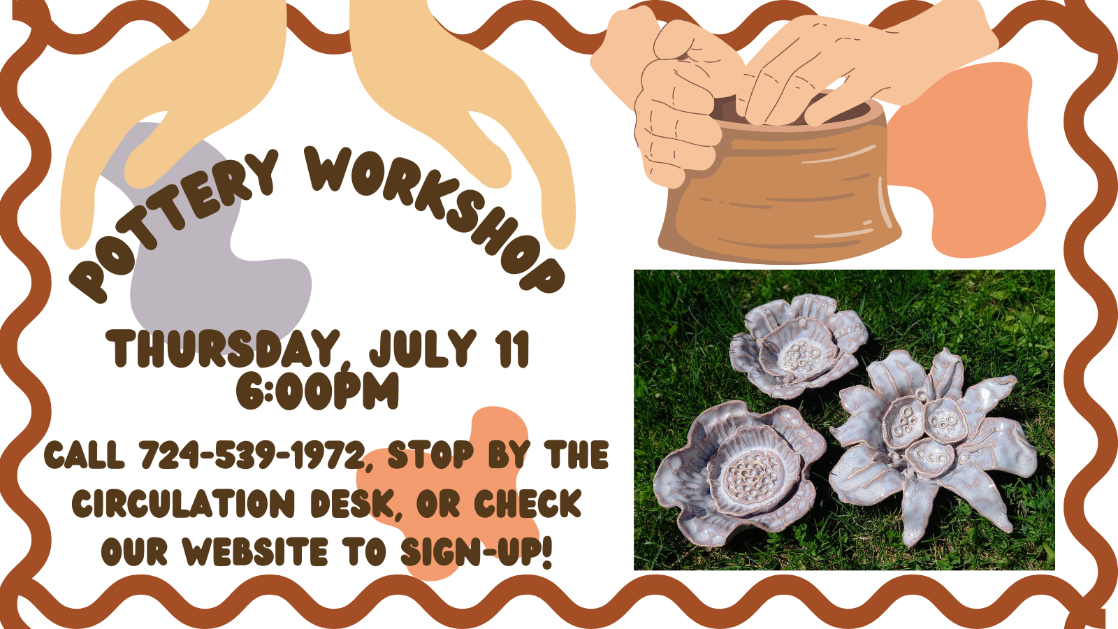 In this pottery workshop you’ll be shown how to create stunning flower dishes and sculptures using clay! Once your pieces are complete, they’ll be taken for drying and firing with the glaze color of your choice. Finished sculptures will be available for pickup at the library on a later date. There will also be a pottery wheel demonstration for those wondering what working with one might entail.