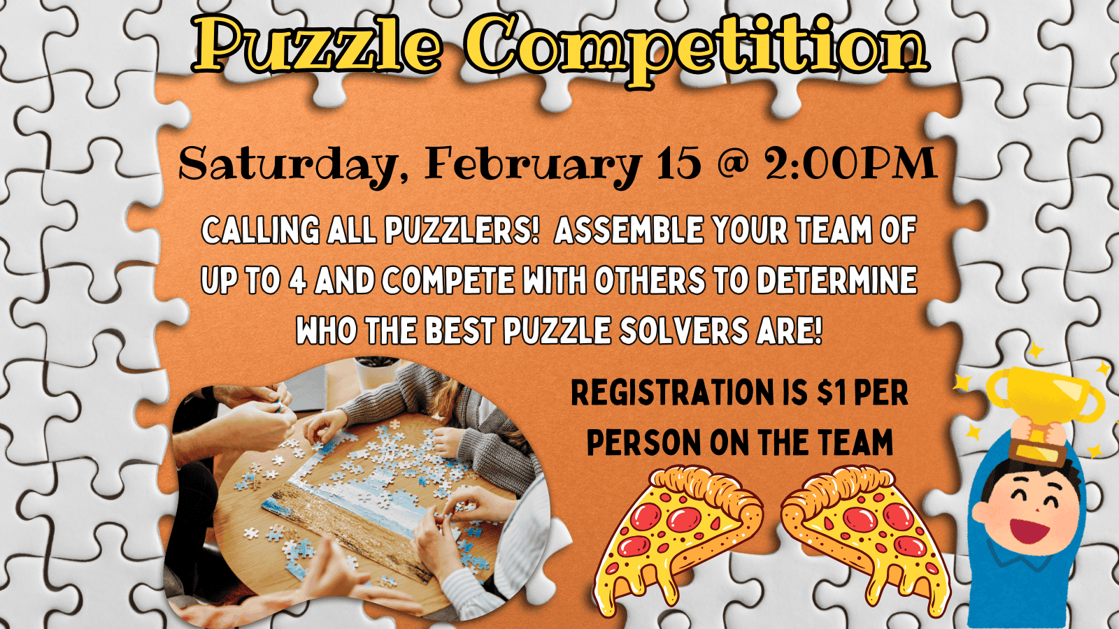 Calling all puzzlers! Assemble your team of up to 4 and compete with others to determine who the best puzzle solvers are!