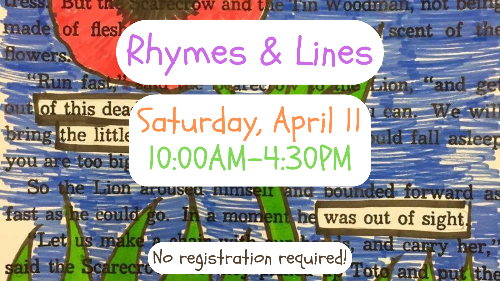 « All Events Rhymes & Lines April 11 @ 10:00 am - 4:30 pm « Preschool Storytime Song & Rhyme Time » Did you know April is National Poetry Month? Celebrate rhyming, limericks, and more with our poetry-related activities from 10:00AM to 4:30PM in the Children’s Room! No registration necessary! Add to calendar Google Calendar iCalendar Outlook 365 Outlook Live Details Date: April 11 Time: 10:00 am - 4:30 pm Event Category: Children & Teens Venue Adams Memorial Library 1112 Ligonier Street Latrobe, PA 15650 United States + Google Map Phone 7245374383 View Venue Website