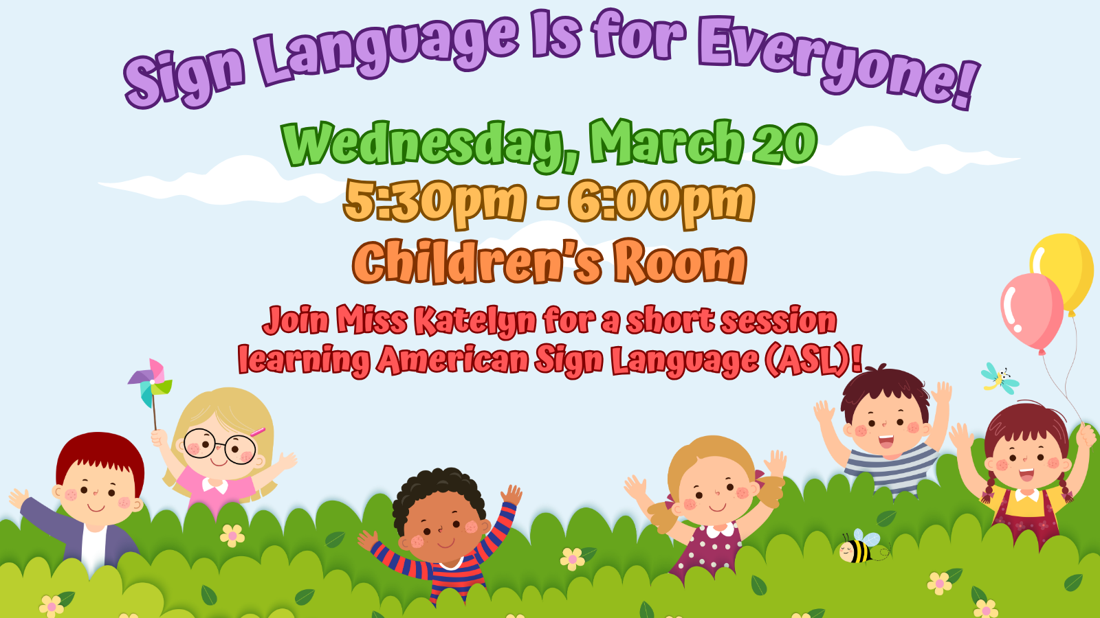 Join Miss Katelyn for a short session learning American Sign Language (ASL)! This program is recommended for children and their grownups ages 3 and up!