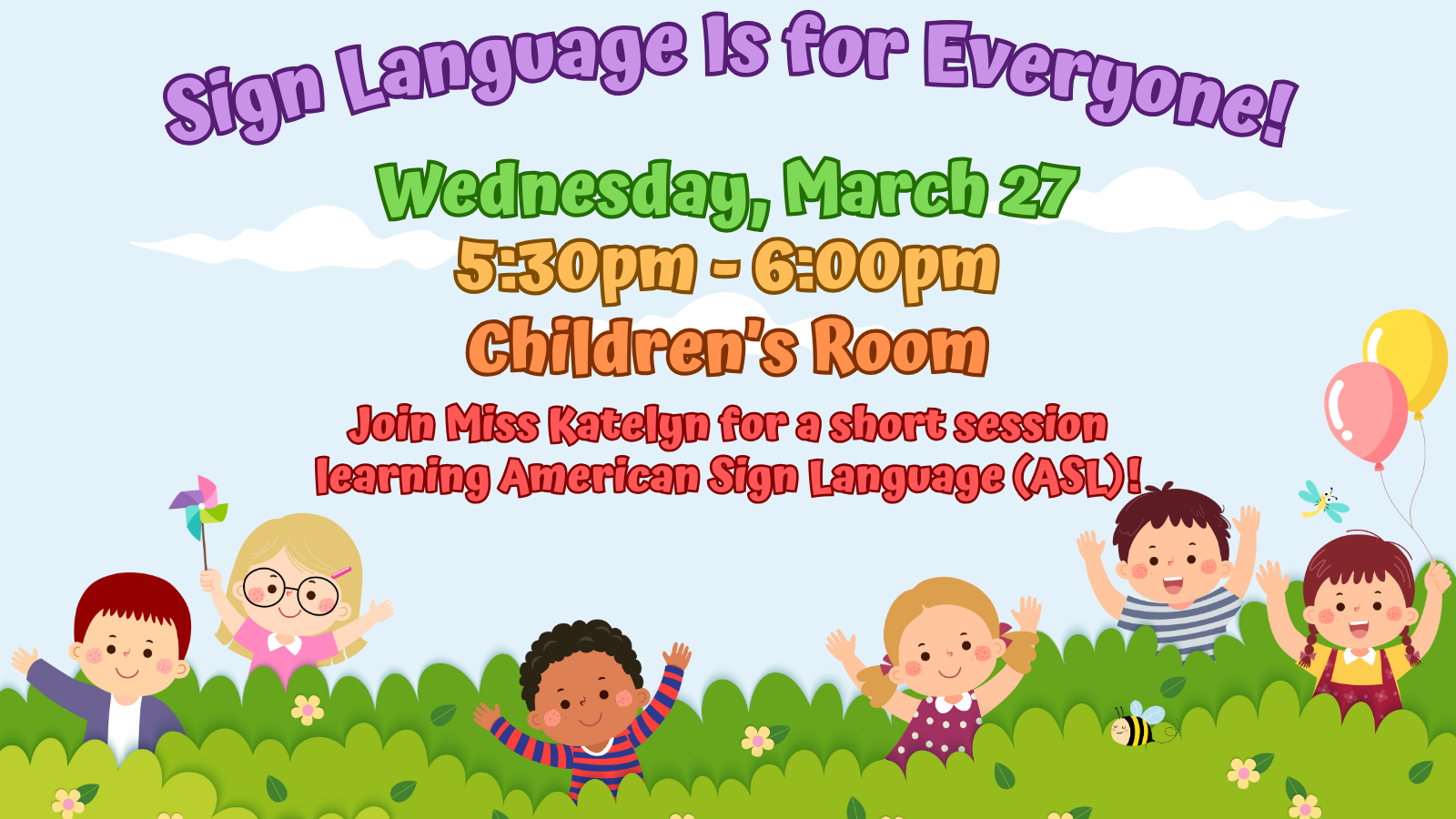 Join Miss Katelyn for a short session learning American Sign Language (ASL)! This program is recommended for children and their grownups ages 3 and up!