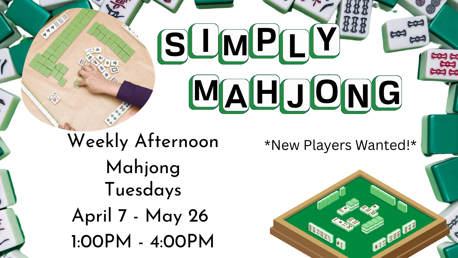 Interested in learning how to play Mahjong? Starting on Tuesday, April 7 learn the rules of how to play Mahjong using the official cards and league manual. From there, weekly Mahjong sessions will be held where players will continue to learn the game by playing with others in-person.