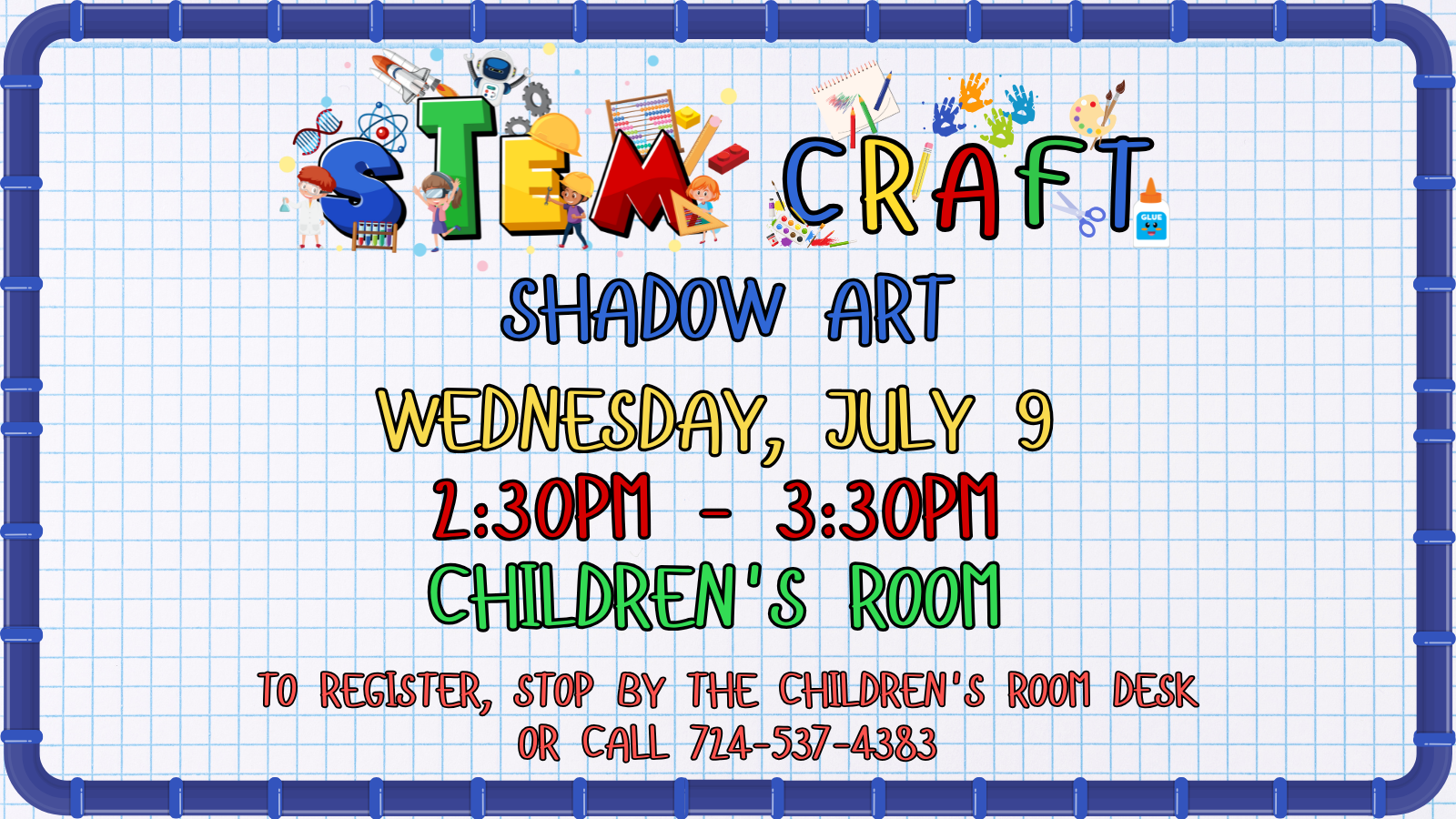 To register, stop by the Children’s Room desk or call 724-537-4383.