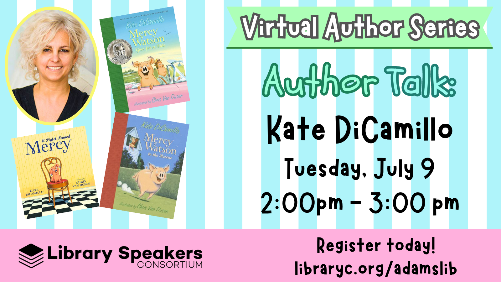 Visit Deckawoo Drive with everyone’s favorite adventure-loving pig, Mercy Watson! Award winning author Kate DiCamillo will be sharing stories of her books and more! This virtual event is geared towards grades Pre-K-2.