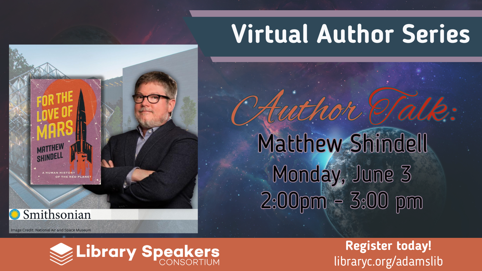 He will be discussing his latest book, For the Love of Mars: A Human History of the Red Planet on Monday, June 3rd at 2 PM via digital live-stream in partnership with Adams Memorial Library!