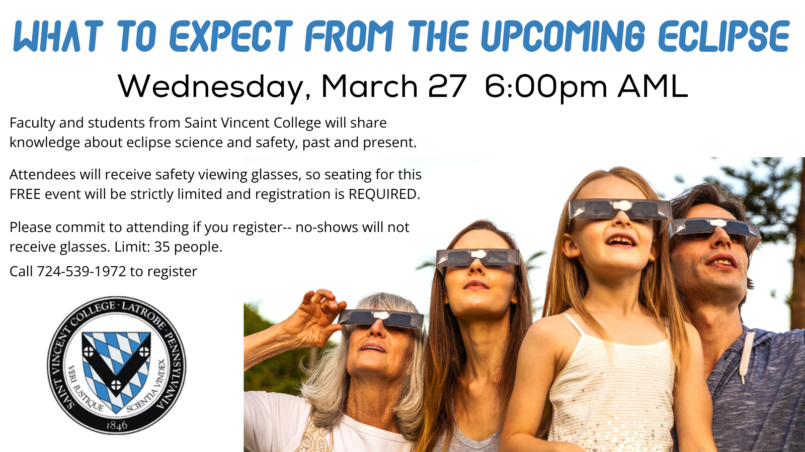 Faculty and students from Saint Vincent College Astronomy Department will share knowledge about eclipse science and safety, past and present!
